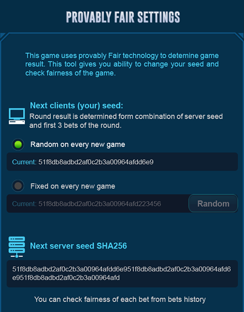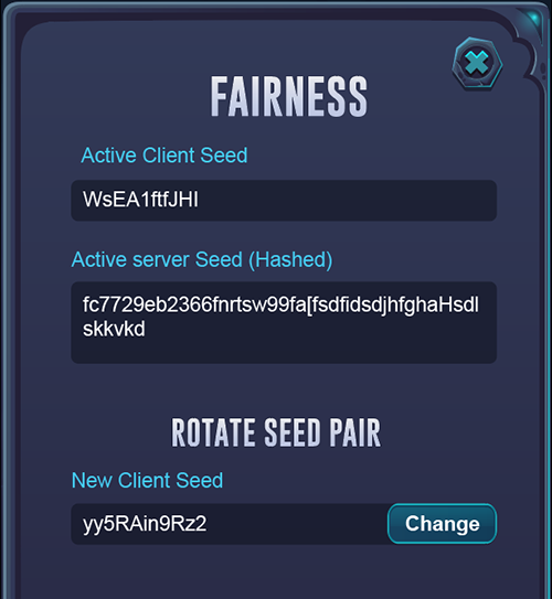 • 為了證明公平性顯示,我們將在每輪客戶端種子中,玩家之前可以根據需要更改客戶端種子。