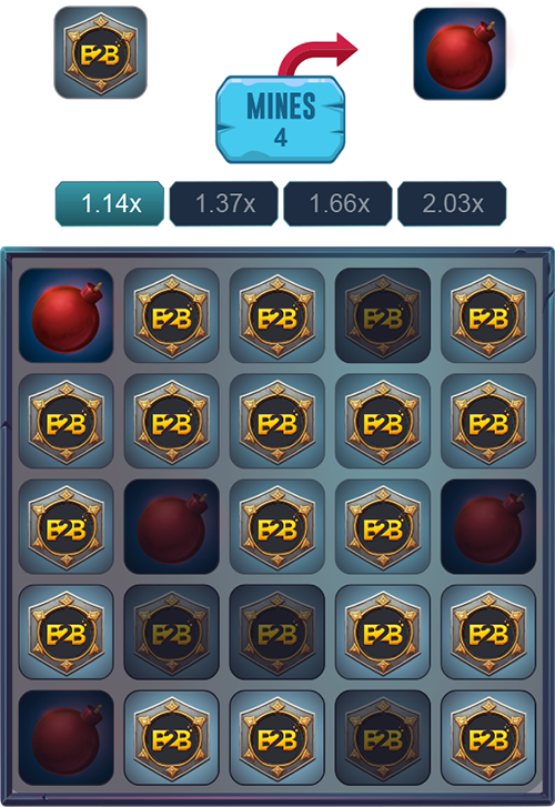 地雷遊戲包含 25 個被覆蓋的檯面,每個檯面下可能有炸彈,也可能沒有。